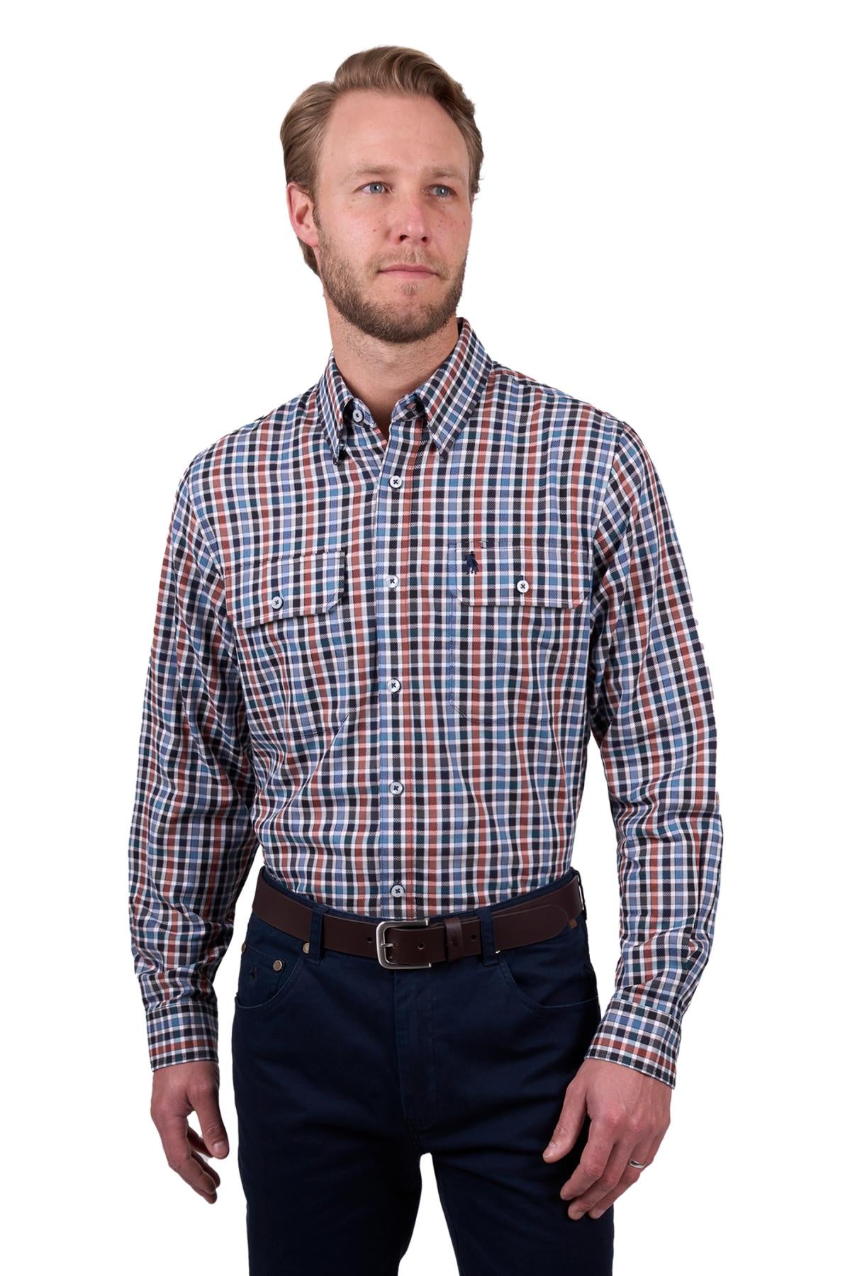 2-Pocket long sleeve shirt, one with pen holder, long shirt tail, back pleat for comfort and movement, concealed collar peak buttons, removable collar stays, horseman embroidery on chest pocket