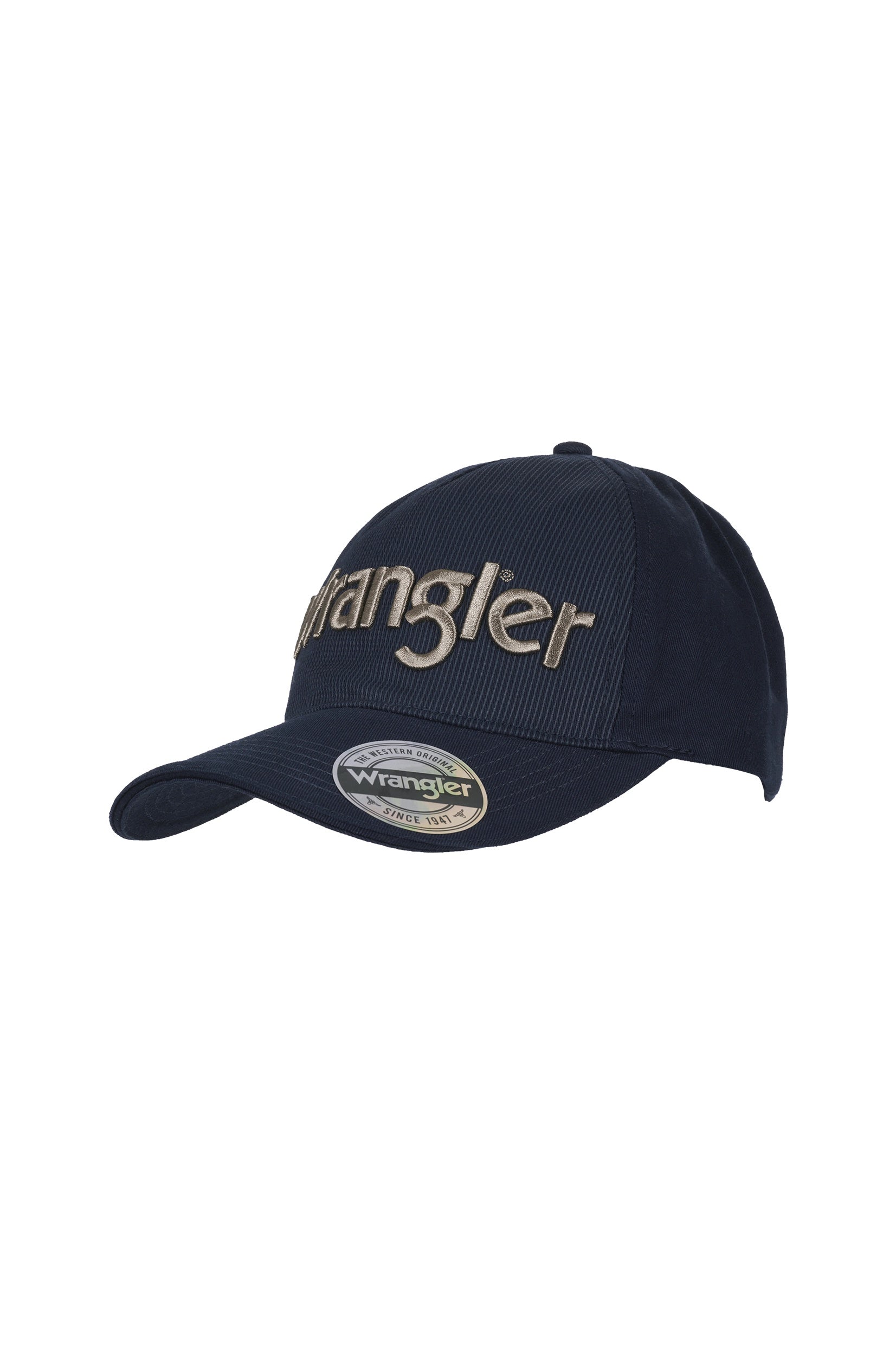 5 panel full back cap, adjustable leather strap, front Wrangler® iconic logo embroidery with printed stripe, Wrangler® iconic logo back embroidery.