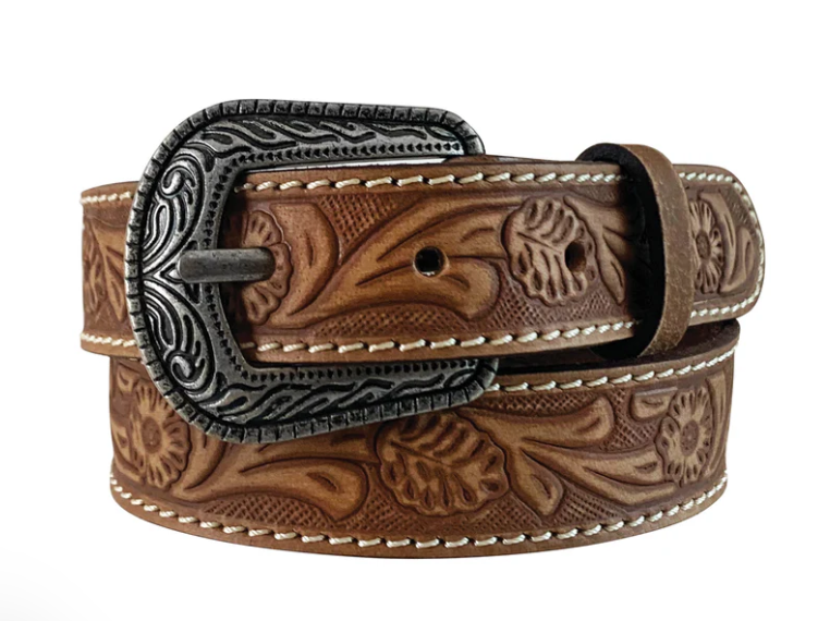 1.1/8" (28mm) Genuine leather with hand tooled design. Buckle in silver finish.