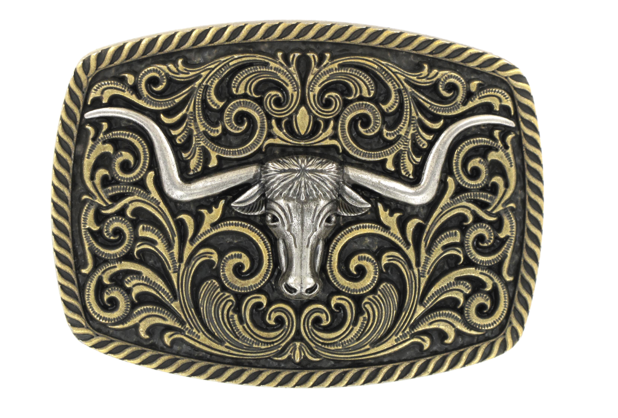 TWO TONE GOLD FILGREE WITH SILVER LONGHORN BELT BUCKLE. ALLOY MATERIAL (LIGHT WEIGHT). BUCKLE SIZE - 9cm * 7.5cm