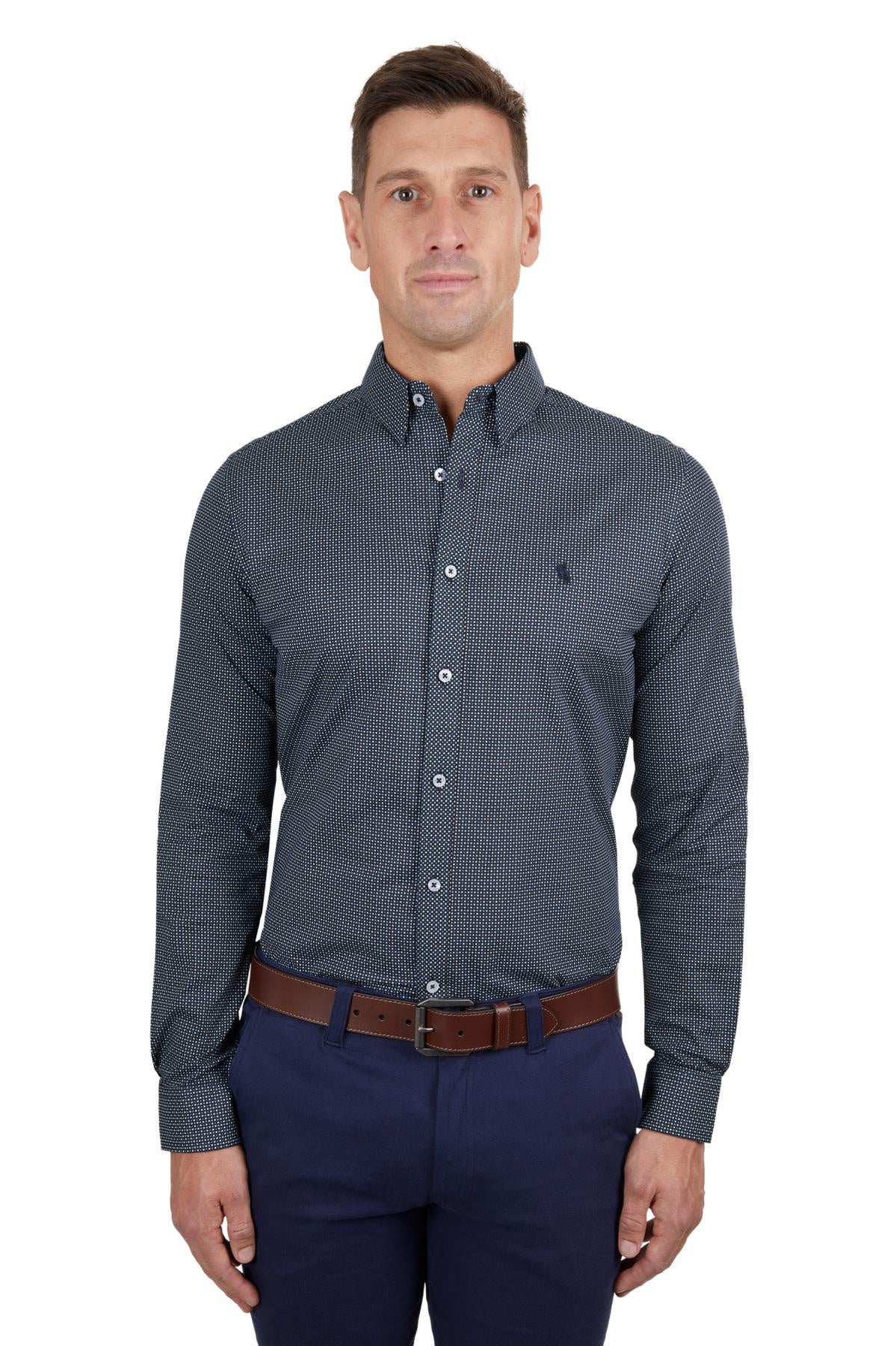 Small scale geometric print, stretch for comfort and movement, contrast chambray facing on inside collar stand, internal neck stripe taping, concealed collar peak buttons, removable collar stays, horseman embroidery on chest