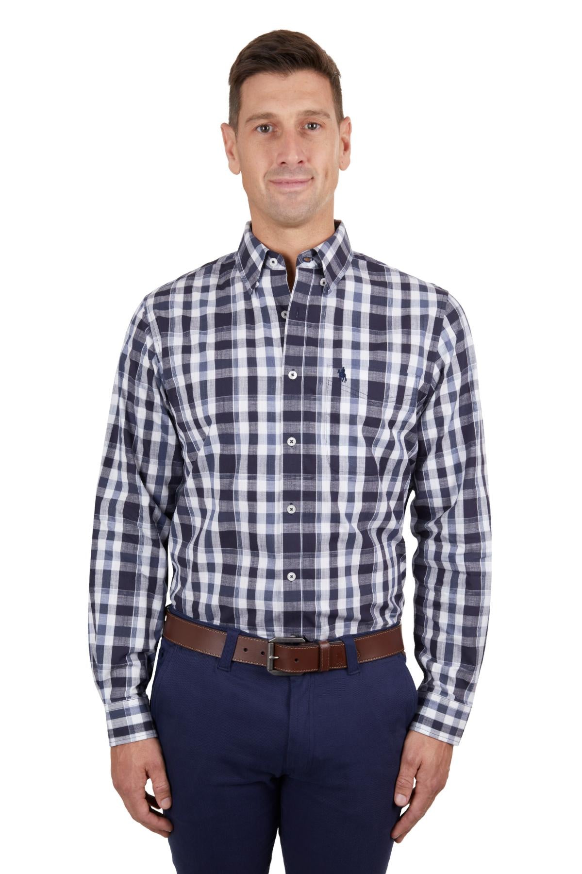 Medium scale yarn dyed check, linen look fabric, contrast chambray facing on inside collar stand, long shirt tail, back pleat for comfort and movement, concealed collar peak buttons, removable collar stays, horseman embroidery on chest pocket