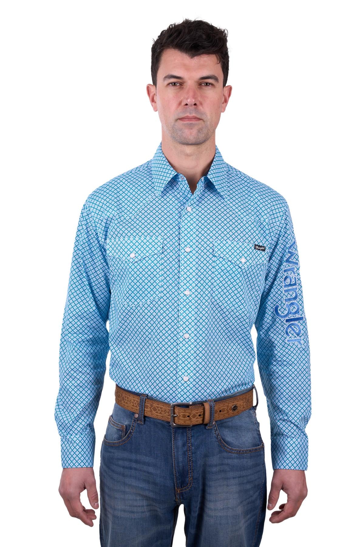 Classic western long sleeve shirt with geometric print, snap closure, western chest pockets (one with pen holder), western front and back yokes, contrast trim on inside collar stand and sleeve cuffs, Wrangler® iconic logo back neck embroidery.