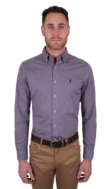 Small geometric print, stretch for comfort and movement, contrast chambray facing on inside collar stand, internal neck stripe taping, concealed collar peak buttons, removable collar stays, horseman embroidery on chest.