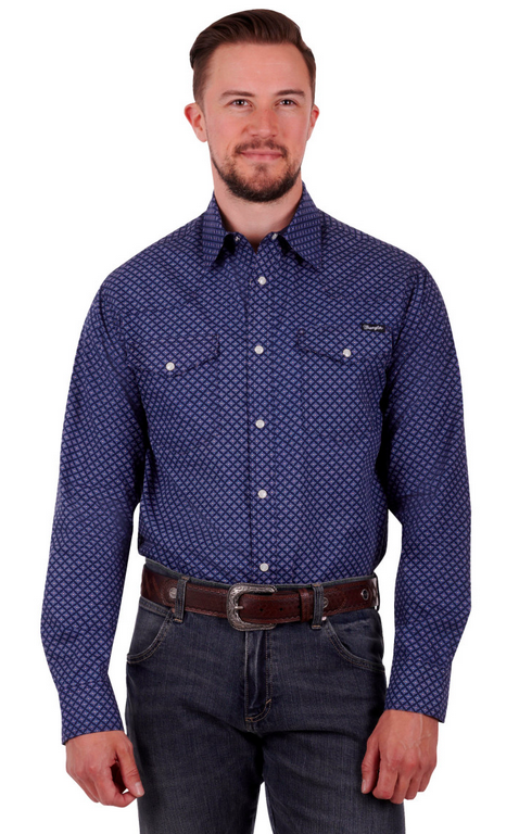 Classic western long sleeve shirt with medium geometric print, snap closure, western chest pockets, one with pen holder, western front and back yokes, contrast trim on inside collar stand and sleeve cuffs.
