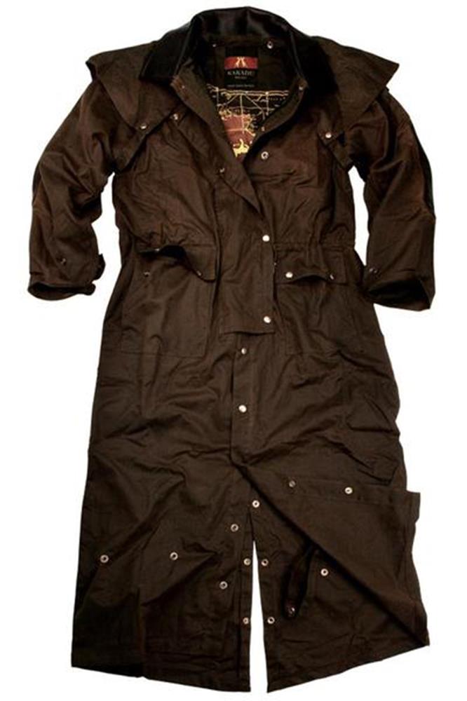 Built from our traditional 12 oz oilskin, brass hardware and cowhide collar and rein guards, adjuster sleeve tabs, detachable cape, stencil printed cotton buggy lined with two internal security pockets and a button-in liner facility. Everything snaps down or closed with added coverage in the front with double storm plackets. Draw corded waist, snap closed back fantail, riding leg straps, flap covered patch pockets with side entry hand warmer pockets. If you don't want it long just roll and snap it up into a 3/4 jacket or convert it into a pair of coveralls.