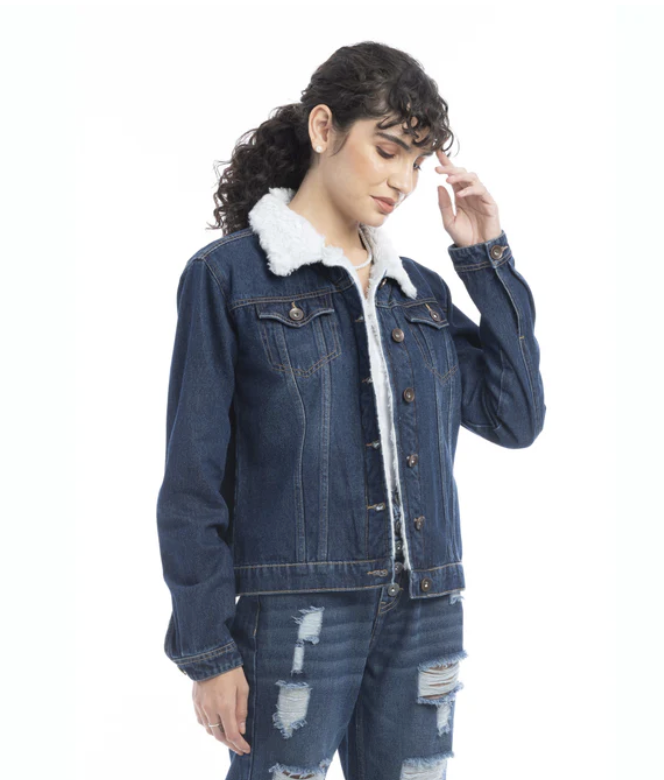 This great denim jacket features not only classic design, but the denim has stars right in the fabric. (Pair with our Shiloh Stars Flared Leg Jeans for a head-to-toe look!) Button front with two pockets and frayed hem at bottom.