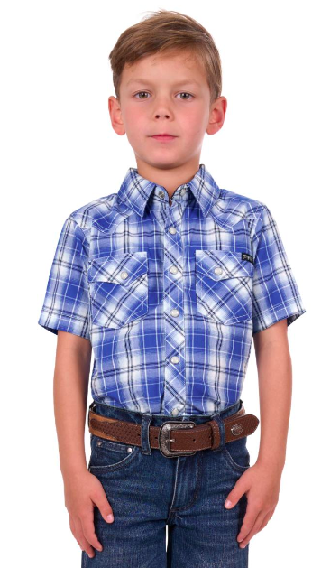 Classic western short sleeve shirt with textured yarn dyed check, Snap closure, Western chest pocket, Western front and back yokes, Contrast trim on inside collar stand and back yoke, Pure Western back neck embroidery.