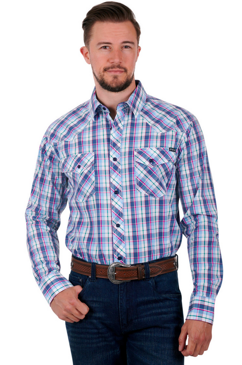 Classic western long sleeve shirt with large check, button closure, western chest pockets (one with pen holder), western front and back yokes, contrast trim on inside collar stand, triple needle stitch detail on yokes and armholes.