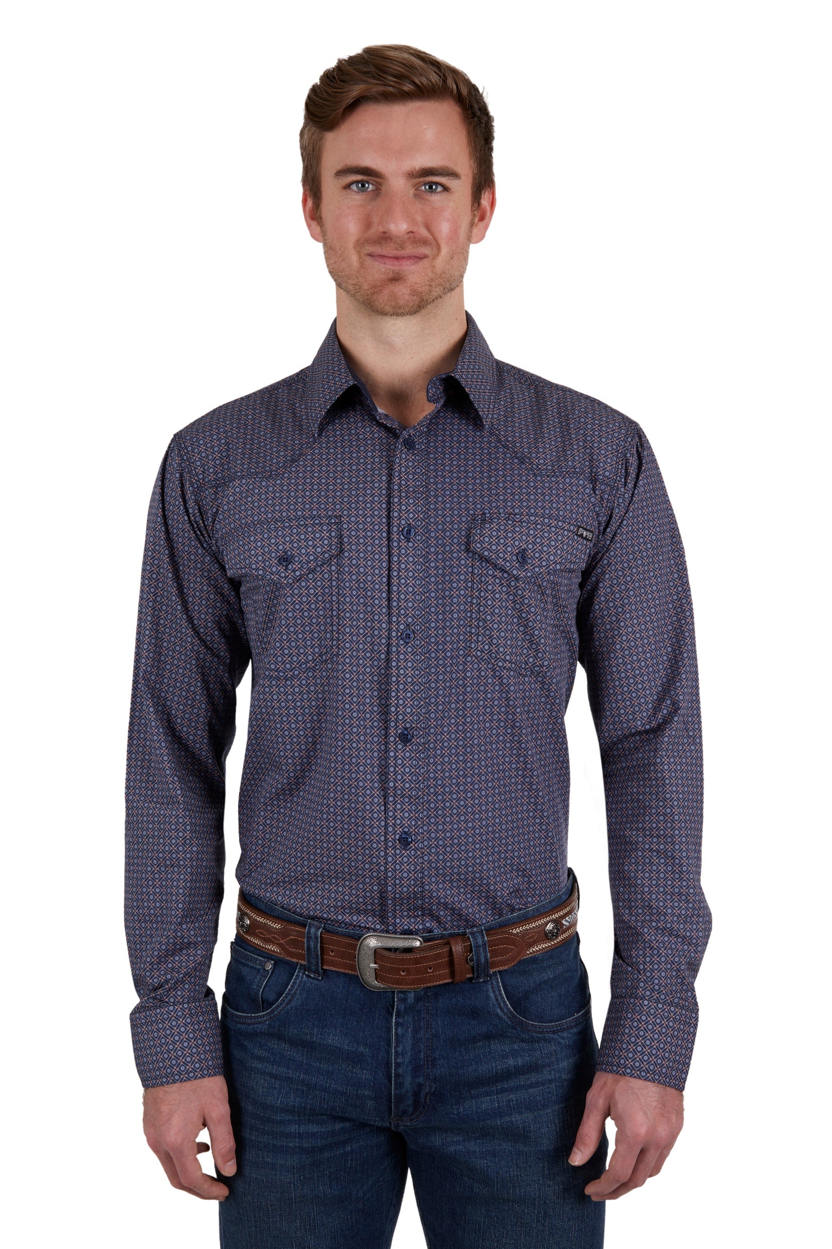 Classic western button down long sleeve shirt with geometric print, button closure, western chest pockets (one with pen holder), western front and back yokes, contrast trim on inside collar stand, triple needle stitch detail on yokes and armholes