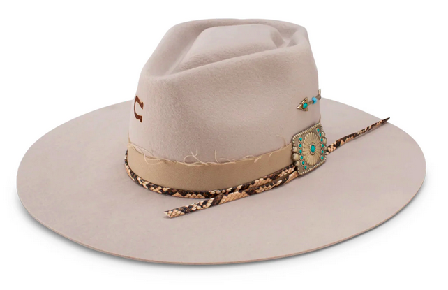 With its delightful design and wilderness inspirations, the Spear Point in Silver Belly is a real standout. This charming wool hat has a 4” flat brim with a 4 1/8” arrowhead crown. The frayed edges and faux snakeskin of the hatband give the Spear Point an aura of the untamed, further suggested by the antiqued silver concho with turquoise highlights. An arrow concho points you in the direction of adventure. The Spear Point is part of the Charlie 1 Horse Rambler Collection.