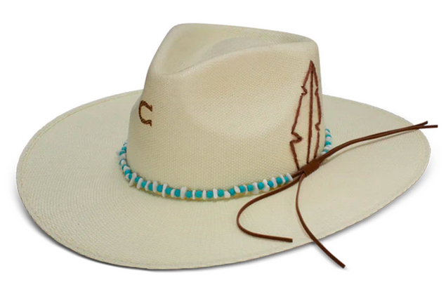 Presented in a light shade to match the aura of a full moon, the Midnight Toker in Natural embodies effortless cool. This striking Bangora straw hat has a 4” pinch-front crown, a 3 3/4" brim, and a cloth sweatband to keep you nice and chill when the temperature rises. Turquoise and white beads on the band lend to the hat’s dreamy effect, while a rope feather design launches the Midnight Toker to legend status. This hat is part of the Charlie 1 Horse Premium Rambler Collection.