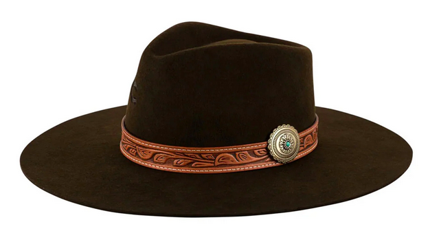 Encapsulate the feeling of being on the sandy beaches with the White Sands hat by Charlie 1 Horse! The pinchfront crown, 3 3/4 inch brim, and the stunningly detailed leather-like hat band are some of the most beautiful details that will catch your eye right away. Take a closer look, and you will see the metal-like and turquoise hat accent on the hat band, the metal-like and turquoise arrow hat pin, and the fire branded Charlie 1 Horse "C" that make this wool hat even more beautiful.